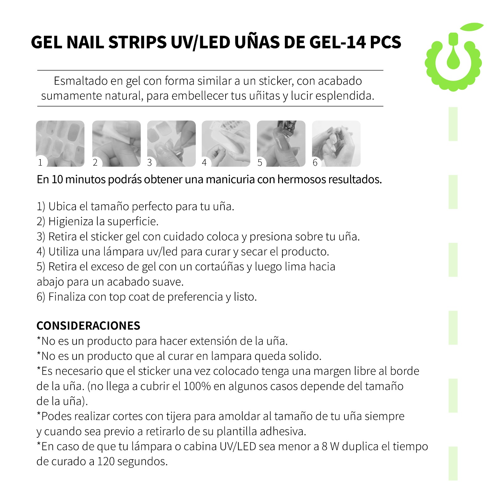 STICKER SEMIPERMANENTE hoy tenemos con nosotros la nueva modalidad de poder realizar tu esmaltado semipermanente en casa y en muy pocos pasos! Solo necesitarás , 15 minutos , una lamparita UV/LED y ganas de lucir tus uñitas hermosas. Contiene 14 piezas de diferentes tamaños en formato sticker , lo que permitirá que sea aún más fácil manejar y colocar sobre las uñas naturales.