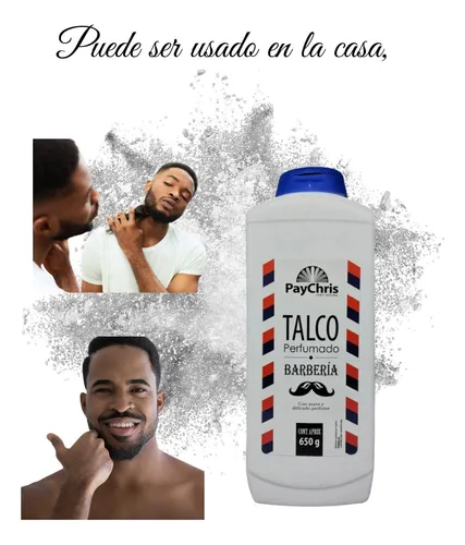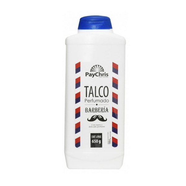 Talco perfumado PayChris 650g. Es importante este producto, ayuda absorber la humedad de la piel y a disminuir la irritación que puede producirse al afeitarse tanto la barba como otras zonas. Resultan muy útiles antes de la depilación porque aspiran el exceso de humedad y facilitan el agarre de la cera.